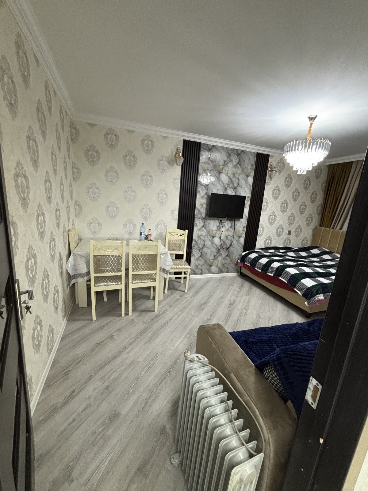 Mətbəx mebeli, şkaf, divan, Tv, jurnalni, ariston (80 L), qaz plitası və yeni pərdələr ilə təchiz olunub