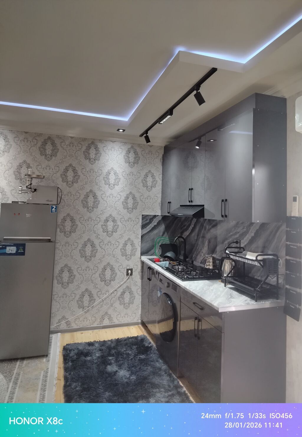 - Ümumi: Zövqlü divar kağızları, spot və trek işıqlandırma, LED xətlər, neytral rəng palitrası.
