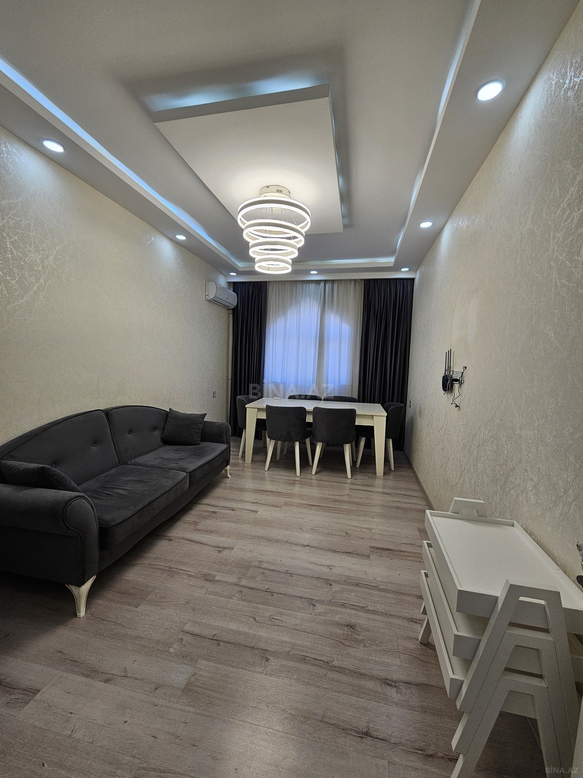 - Zal: L‑şəkilli yumşaq künc divan, dekorativ tavan işıqları, divar saatı, pərdə və jalüzlər, xalça, balaca jurnal masası. Yemək hissəsində taxta stol və yumşaq stullar.