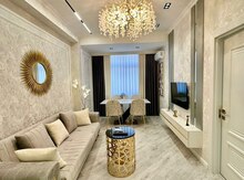 - Sanitar qovşaq: duş kabinəsi (şüşə bölmə), asma tavan işıqlandırması, mərmər naxışlı kafel, asma dolablı lavabo, müasir qarışdırıcılar