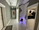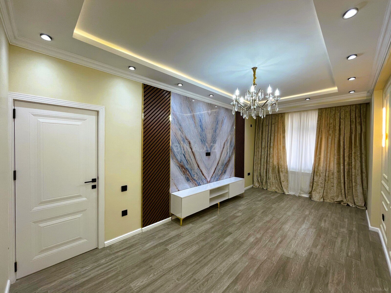 - Keyfiyyətli parket döşəmə, mərmər fakturalı dekor panellər və qızılı aksentlər