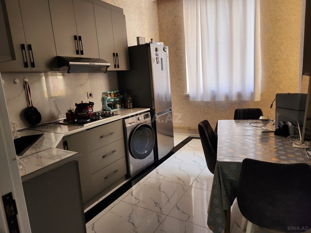 - Mətbəx: 4 nəfərlik yemək masası və stullar, iki qapılı soyuducu, üstündə mikrodalğalı soba, mərmər effekti verən divar və tavan işləməsi, pərdə, quraşdırıl ...