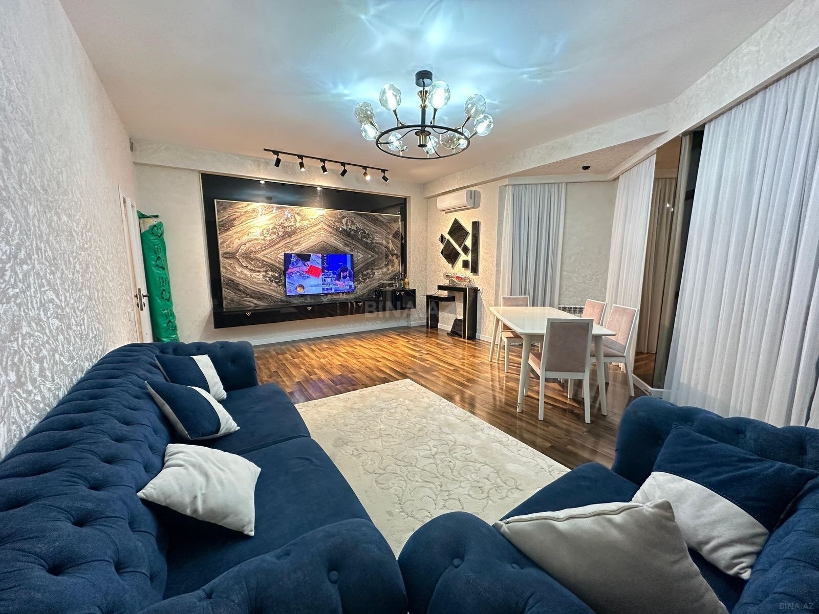 - Zövqlü layihələndirilmiş qonaq otağı: dekorativ gips tavan, LED-spot işıqlar, klassik şamdan tipli çilçıraq, iri dekorativ güllü divar paneli. Yumşaq L-formalı divan, 4 nəfərlik yemək masası və 4 stul. Divar tipli TV və uzun media-konsol (üst dolab modulları ilə).