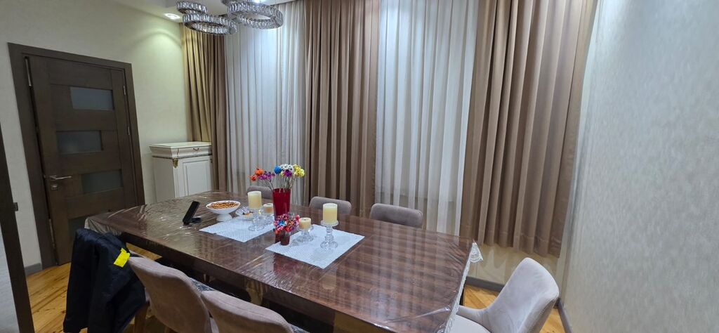 - Yemək otağı: iri taxta masa, 6 yumşaq oturacaqlı stul, dekorativ işıqlandırma, pəncərədən tavana qədər qalın və tull pərdələr.