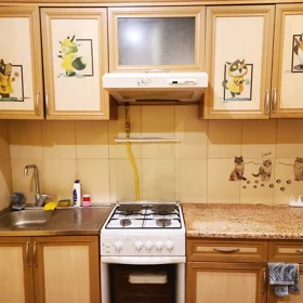 - Mətbəx: taxta teksturalı mebel, quraşdırılmış qaz plitəsi, aspirator, işıqlı pəncərə və eyvana çıxış, geniş yemək sahəsi