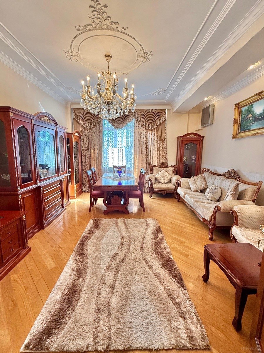 Квартира располагается на 3-м этаже 5-ми этажного здания. 2-комнатная квартира, состоящая из гостиной, спальни, кухни и ванной комнаты и два балкона с общей площадью 64кв.м., с боковым видом на памятник Ахундова и на закрытый двор. Квартира полностью оборудована мебелью и бытовой техникой: 2 кондиционера, 1 телевизора, холодильник, стиральная машина, духовка и микроволновка, централизованное отопление.
