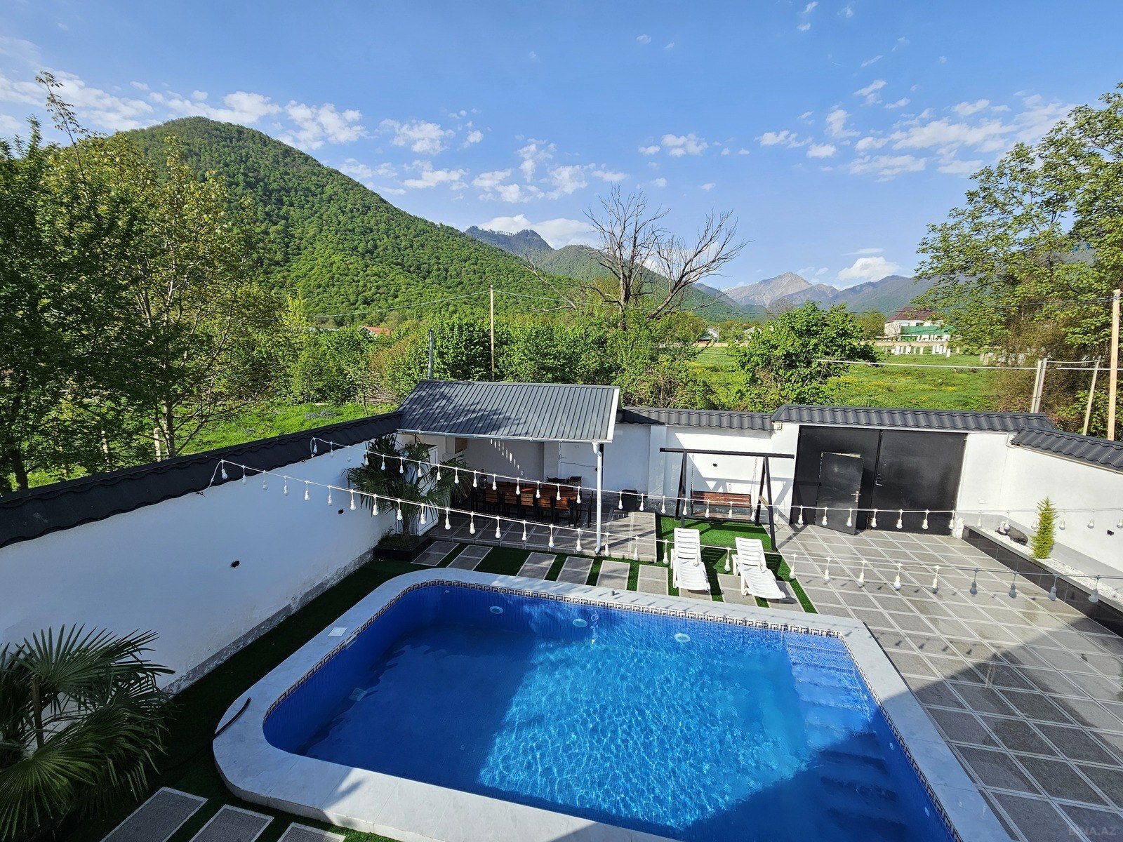 Qebelede dağin eteyinde cox gozel seraiti olan isti Hovuzlu A Frame ev 3 yataq otagi 6 tam yatacaq 1 ekstra isti Hovuz manqal samavar balkondan daga menzere