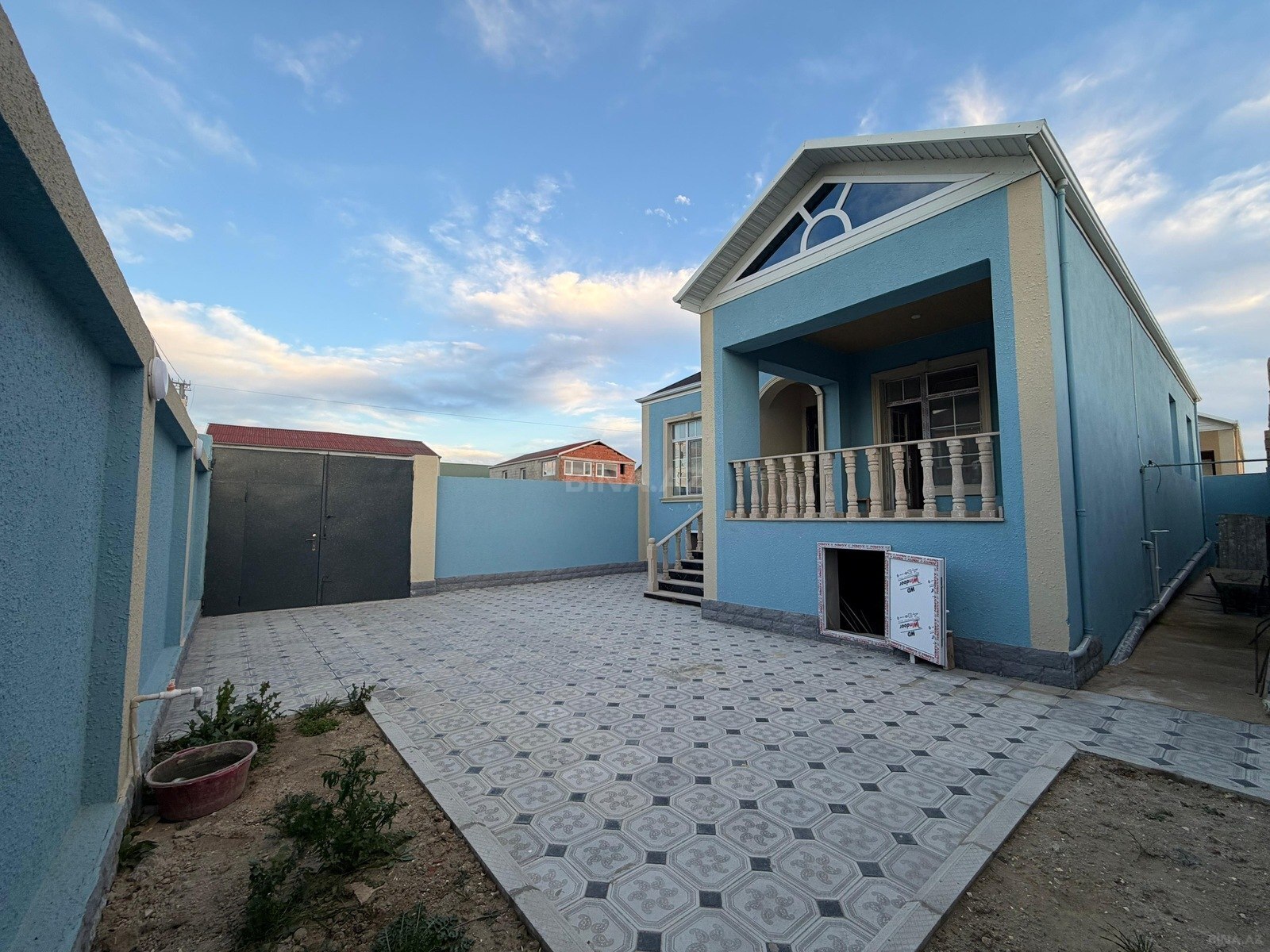 - Ev bir mərtəbəli korpus və üstündə açıq terras/eyvanla (pilləkənlə çıxış) təchiz olunub