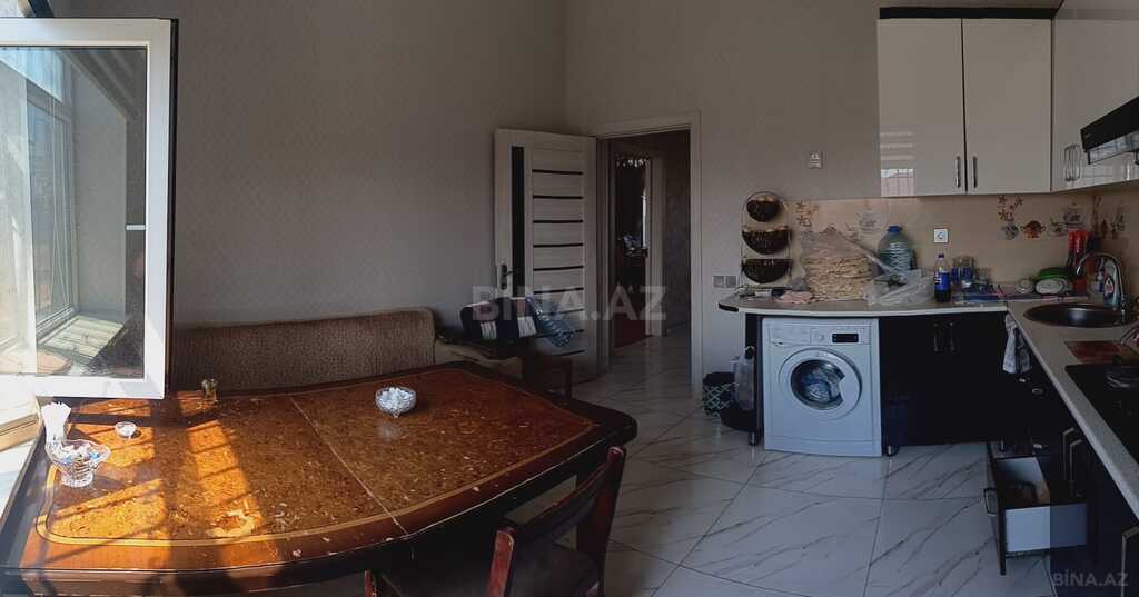 - Evin daxili: işıqlı böyük otaq, açıq rəng laminat döşəmə, dekorativ divar nişləri və spot işıqlandırma. Tavan karnizi və rozetkalar quraşdırılıb, girişdə şüşəli taxta qapı.