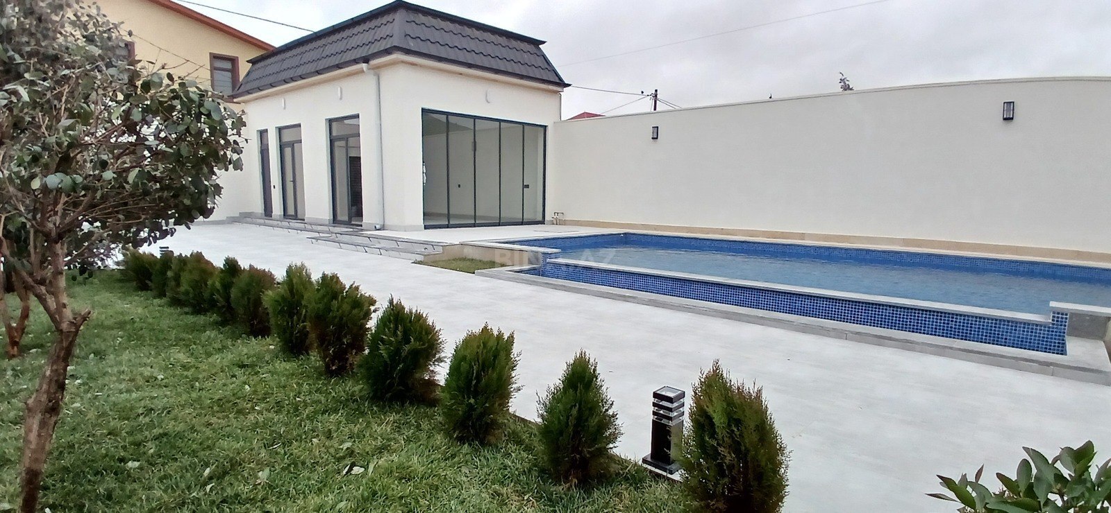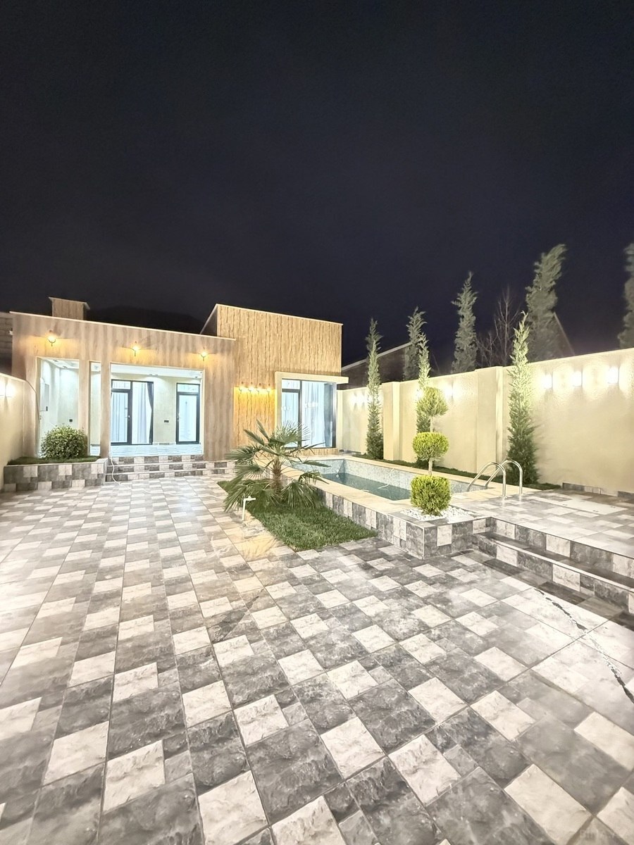- Həyətdə mozaika üzlüklü üzgüçülük hovuzu, paslanmayan pilləkən və su dövriyyə sistemləri