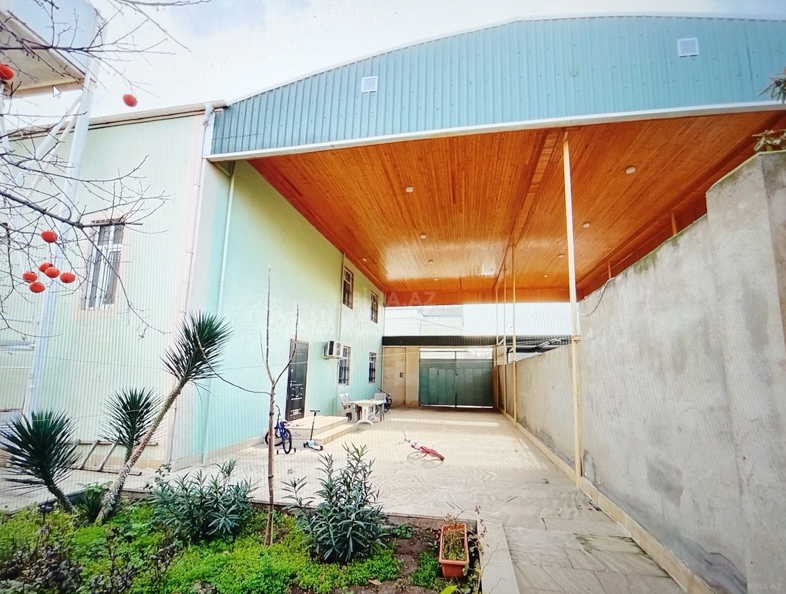 - Geniş, naxışlı və mozaik plitələrlə döşənmiş həyət, gül zolaqları və dekorativ yaşıllıq