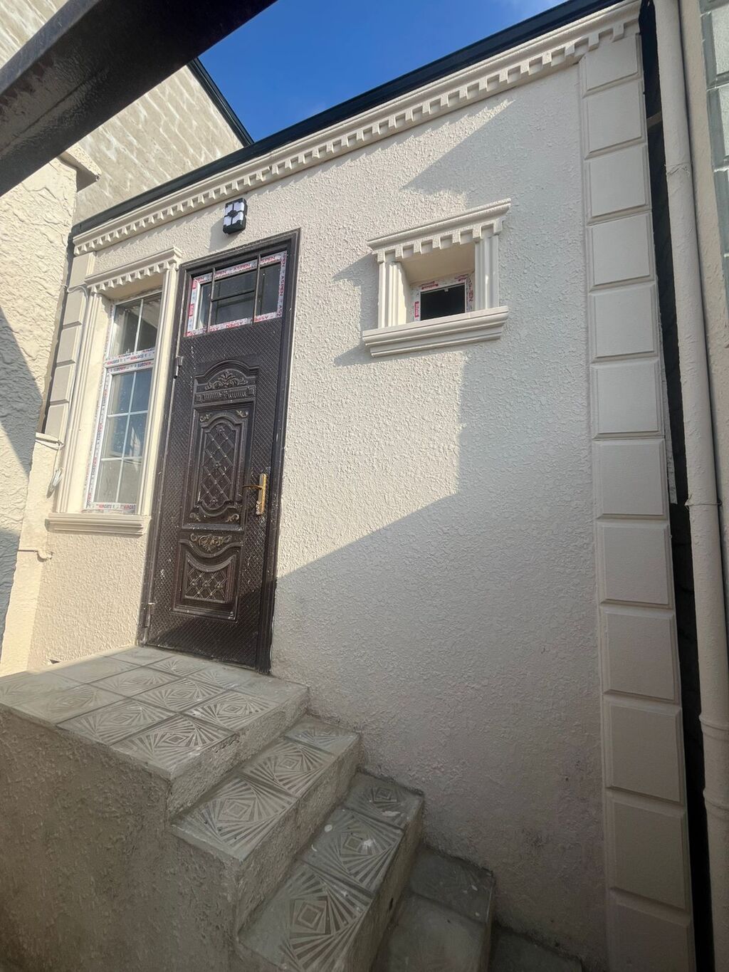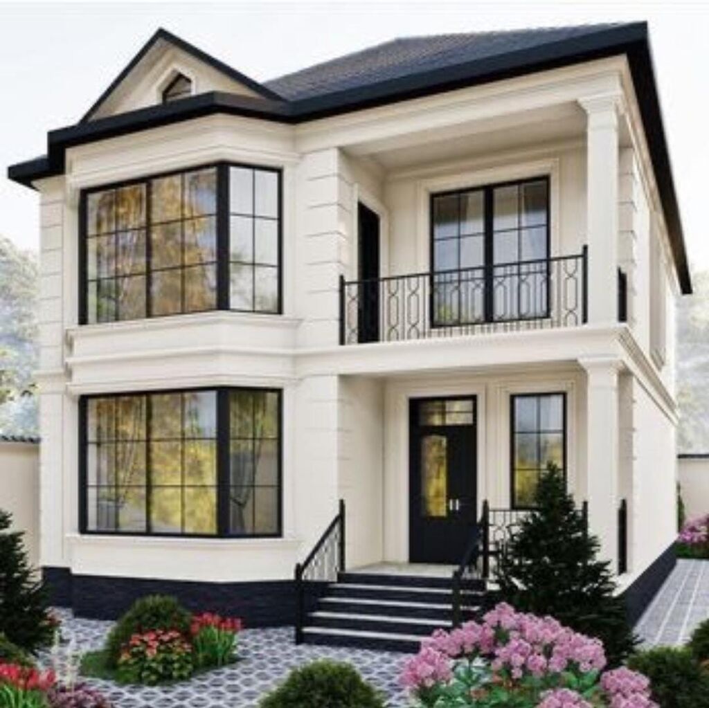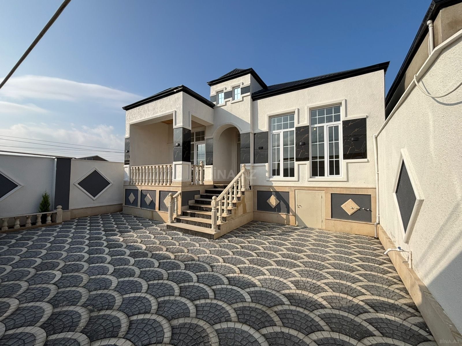 - Klassik fasad, geniş panoram pəncərələr, eyvan və ön pilləkənli giriş