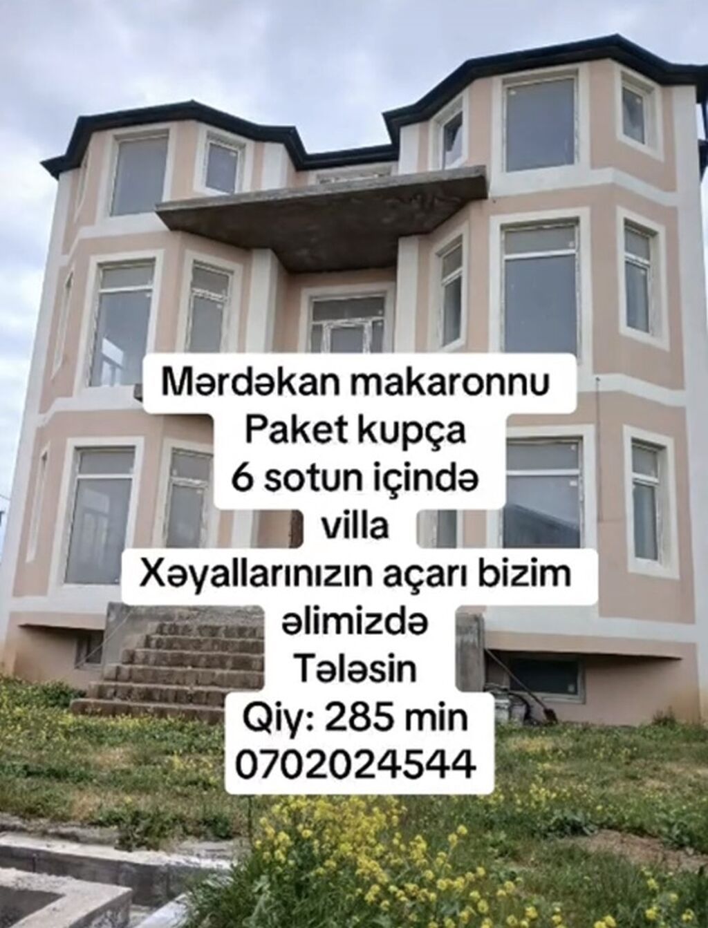 Mərdəkan, “Makaronnu” deyilən ərazidə yerləşən 3 mərtəbəli villa. Torpaq sahəsi: 6 sot. Sənəd: paket kupça.