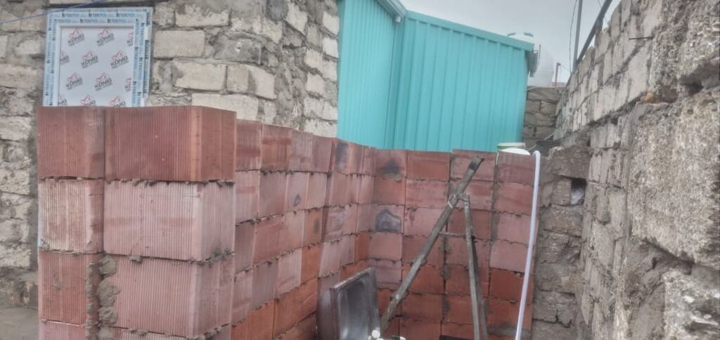 Satılır: modul tipli həyət daxilində yarımçıq tikili və sanitar qovşağı. Su, işığ, qaz, internet. - Material: qırmızı keramik blok və yerli daş divarlar - Tikilinin ölçüləri şəkillərdə görünür; həyətdə ayrıca hörgü ilə ayrılmış sanitar qovşaq zonası var - Sanitar avadanlıq: döşəmə tipli unitaz bakı ilə, lavabo; döşəmə keramoqranit plitə ilə örtülüb, döşəmə trapı quraşdırılıb - Daxili örtük: taxta/laminat tipli dekorativ divar panelləri - Həyət: daş hasarlarla əhatələnmiş, geniş torpaq sahəsi; yardımcı tikili/şaxta və su çəni üçün yer - Qapı-pəncərə açılışları hazırlanıb; plastik qapı-pəncərə profilləri üçün çərçivə qoyuluşu görünür - Kommunikasiya üçün giriş xətləri üçün yerlər ayrılıb