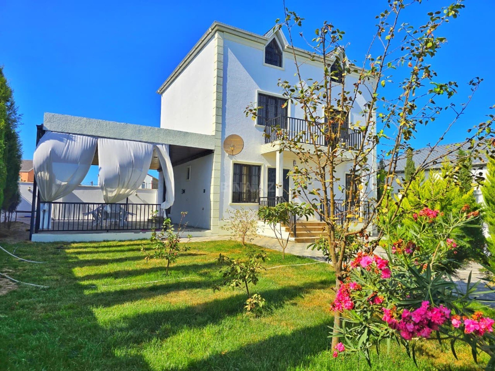 Mərdəkanda (Bravo yolu, Yeni Araz marketin yanında), 4 sot torpaqda, yol kənarında yerləşən, fərqli dizaynda inşa edilmiş 2 mərtəbəli, 5 otaqlı modern bağ evi satılır. 4 yataq otağı, geniş zal, mətbəx, qarderob, 4 hamam otağı, isti döşəmə (kombi), filterli daşma hovuz, manqal, terras, yay mətbəxi (besetka), açıq qaraj. Qaz, su, işıq – dövlət xətləri ilə. Çıxarış (kupça) mövcuddur.
