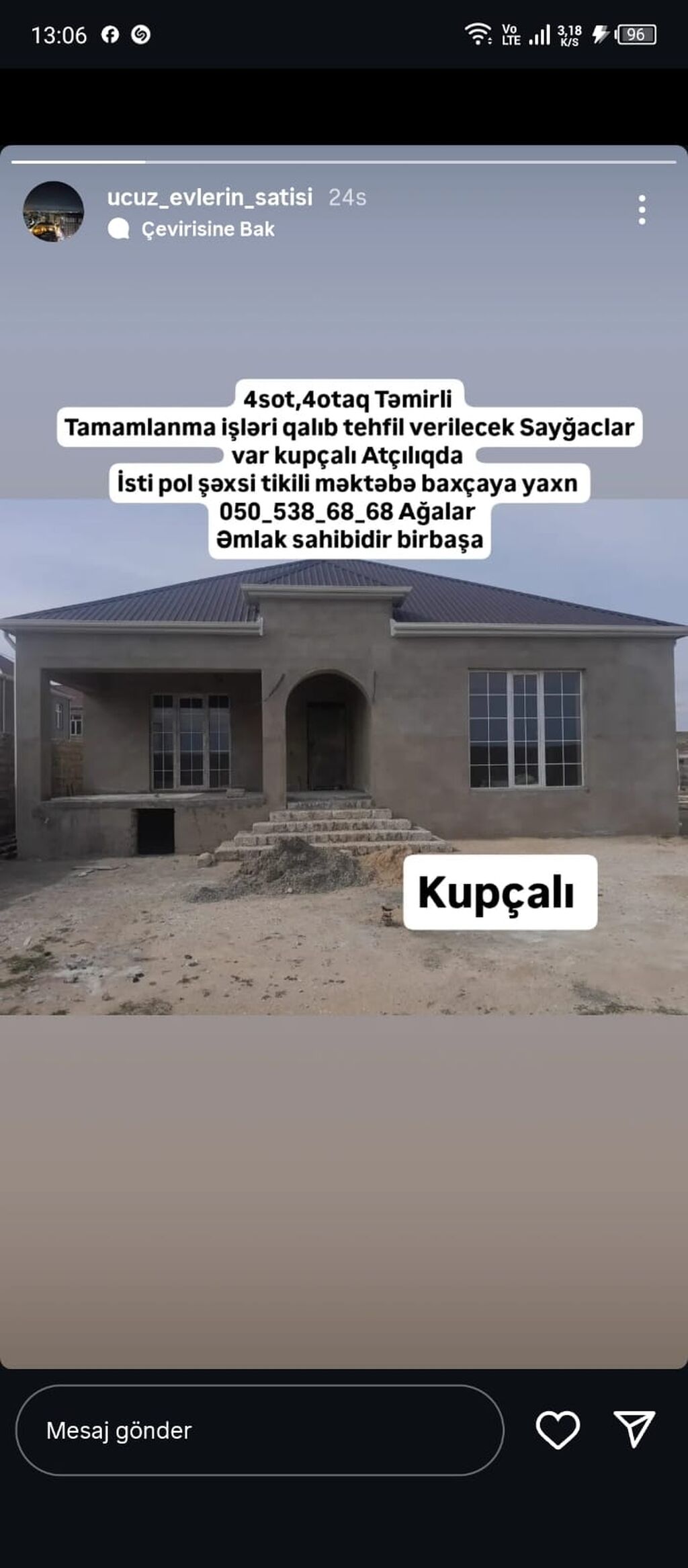 Abweron Rayonu Mehdabad Qesebesinde Uzu Digaha geden yolda Yoldan 350m icerde 3sotda 4otagli tam temirli tehvil verilecek 4otag 3otag bir zal metbex kaldor isti pol Sanuzel sanitar qovwagi isti pol olacag qapini ac gir ev olacag kim istese elaqe saxlaya biler suyu isigi qazi senedi ferdi yawayiw pramoy qeydiyata duw eve Qiymeti 115000real alici olsa endirim olunacag