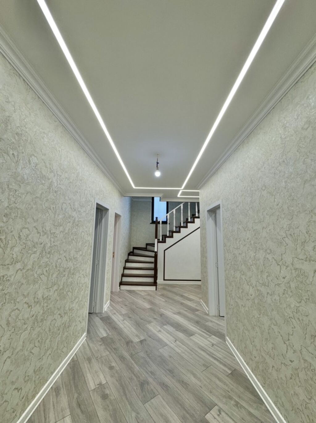 Paket Kupça İpoteyka üçün tam yararlı ! 118 nömreli avtobus yaxınlıqdan keçir WhatsApp mövcutdur İki mərtəbəli müasir fərdi ev - Arxitektur dizayn: Geniş vitrajlı fasad, iki eyvan, dekorativ məhəccərli pilləkən və mərmər effekti pillələr. Girişdə işıqlı eyvan-zal bloku. - Planlaşdırma: Geniş dəhliz, böyük qonaq otağı panoramik pəncərə ilə, bir neçə izolyasiya olunmuş otaq, mərtəbələrarası rahat pilləkən. - İnteryer: Yüksək tavanlar, LED xətli gizli işıqlandırma, klassik karnizlər və dekor panelləri. Döşəmə – açıq boz tonlarda laminat/parket fakturalı örtük, divarlarda dekorativ suvardak. - Sanitar qovşaqlar: Tam kafel-metlax, mermer naxışlı və abstrakt panel kombinasiyası, tavanda LED ko ...