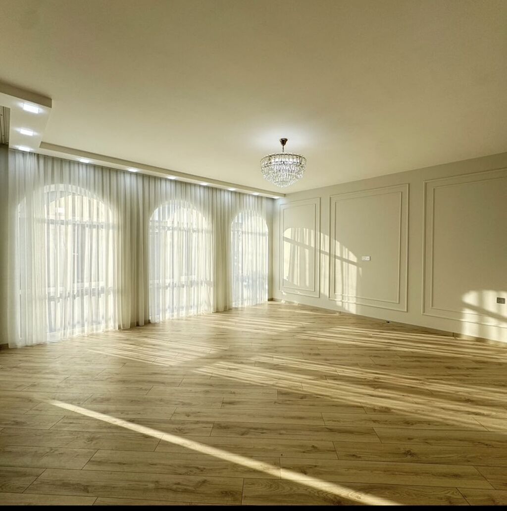 - Otaq planı: Geniş salon açıq mətbəxə keçidlə; hündür tavan, panoram pəncərələr və kristal çilçıraq