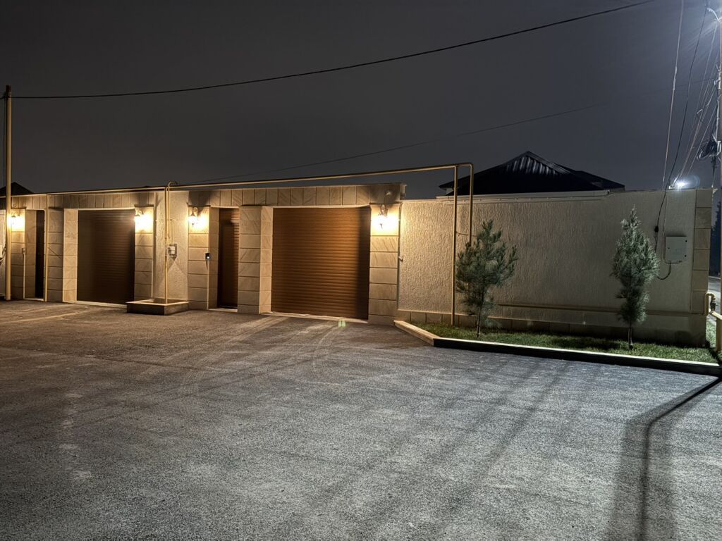 Villa tipli həyət evi – dekorativ işıqlandırmalı geniş həyət və qapalı qaraj - Memarlıq: Yüksək tavanlı giriş portiku, tağlı iri pəncərələr, fasadda dekorativ daş işləmələr və isti tonlarda gecə işıqlandırması. - Həyət: Tam abadlaşdırılıb; bordürlərlə ayrılmış yaşıl zolaqlar, həmişəyaşıl kollar, əkilmiş şam ağacları, damcılı suvarma üçün kommunikasiya çıxışları. - Döşəmə: Hərəkət zolaqları və dayanacaq sahəsi qranit/çınqıl mozaika tipli dekorativ metlax-la döşənib; avtomobil giriş yolu genişdir. - İşıqlandırma: Həm fasadda, həm də həyət yolunda müasir LED dirək lampaları quraşdırılıb, qaraj və giriş hissəsində divar aplikləri mövcuddur. - Qaraj: Avtomatik jalüz tipli qapılar; bir neçə maşın ...
