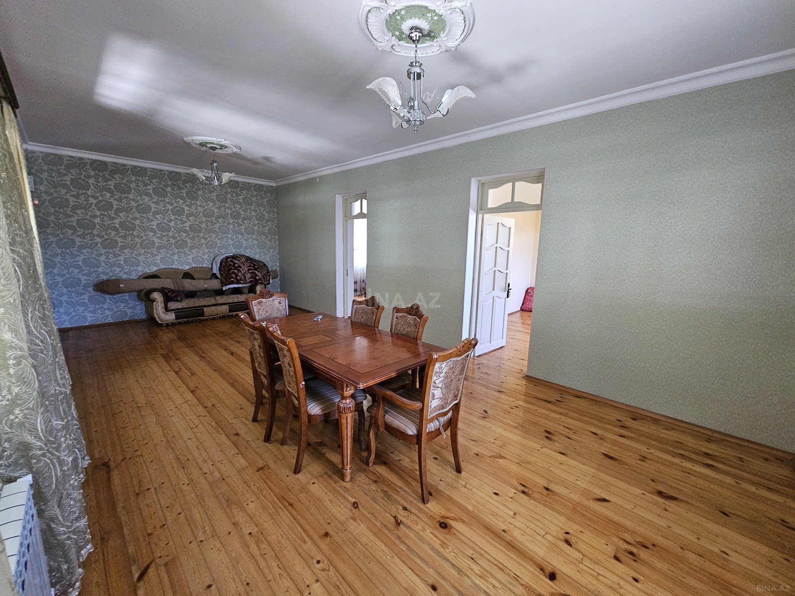 - Daxildə zövqlü təmir: hündür tavanlar, dekorativ karnizlər, quraşdırılmış işıqlandırma, mərmər üslublu giriş və geniş zal