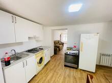 Kirayə üçün tam mebellı və avadanlıqlı 3 otaqlı həyət evi - Plan: yataq otağı, geniş mətbəx-studiya tipli zal, ayrıca yemək otağı - Yataq otağı: iki nəfərlik taxta çarpayı, böyük 3 qapılı şkaf, güzgülü komod; taxta döşəmə, pəncərə və ventilyasiya üçün yuxarı açılan fortoçkalar - Zal/mətbəx: divar şkafları, qaz plıtəsi, aspirator, mətbəx lavası, paltaryuyan, soyuducu; divan-kreslolar, divara quraşdırılmış TV; kondisioner - Yemək otağı: böyük masa və 6 plastik stul - Döşəmələr: taxta - İsitmə sistemi: radiatorlu mərkəzi qızdırma - İşıqlandırma: LED spotlar - Pəncərələr: plastik çərçivəli - Giriş qapısı dəmir - Əlavə: kərpic/plitka arakəsməli mətbəx fasadı, xalça Şəkillərdə görünən bütün mebe ...