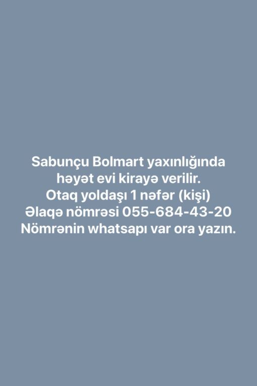 Sabunçuda həyət evi kirayə verilir. 2 otaq hər şəraiti var wifidə. Otaq yoldaşı 1 nəfər axtarılır qiyməti 120 azn. Əlavə məlumat üçün whatsapa yazın.