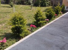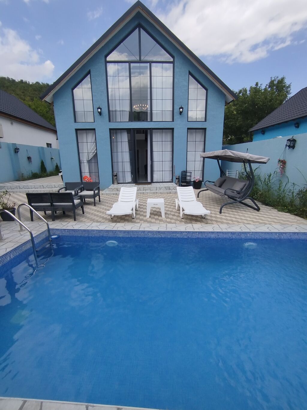 Həyətdə filterli hovuz besetka manqalni dekorativ agaclar mövcuddur