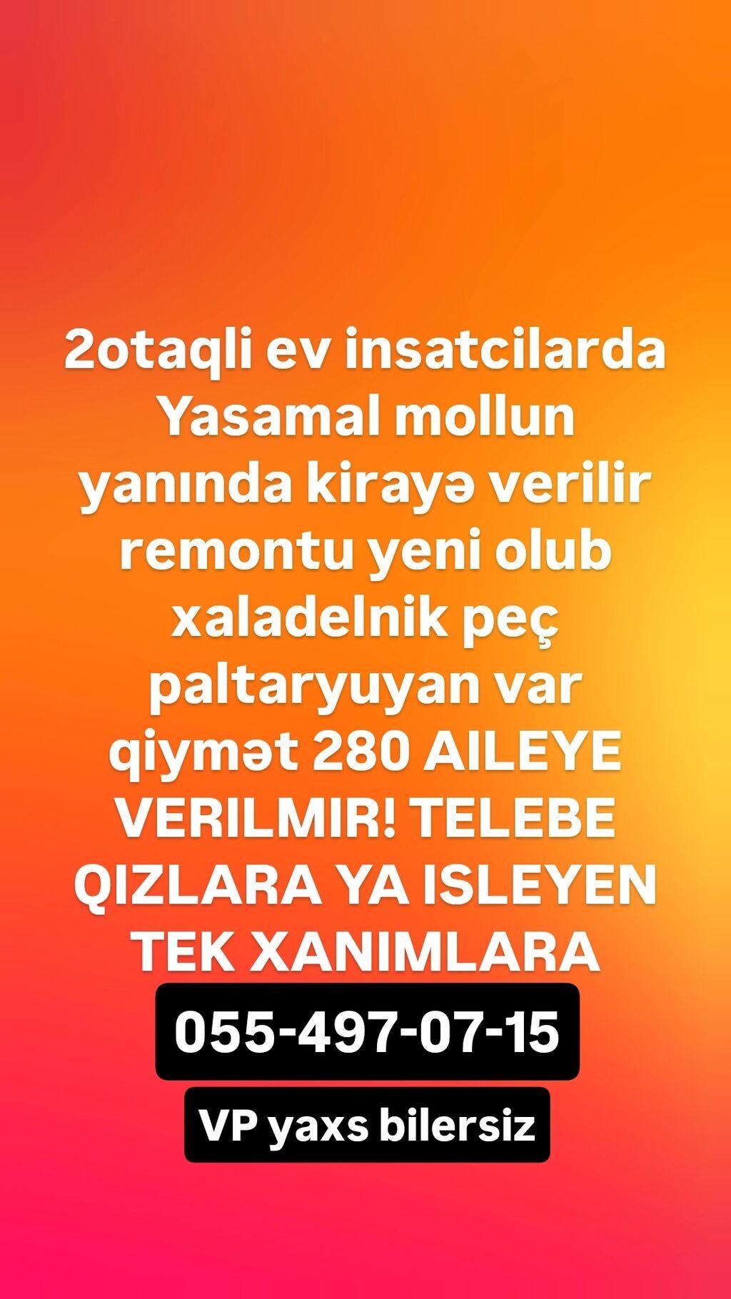 Diqqətle oxuyun ev xazeykalidi Xod tam ayrıdı Yalnız xanımlara verilir ayileye verilmir Nərimanov rayonu Kitay restoranin yani ev ilə metro məsafe peşkom 7-8 dəq Universitetlere baxçalara məktəblərə yaxın yerdədi 1 otaqlidi rahat geniş İstilik sistemi, Sürətli internet, isti suyu her şeyi var kominal ödənişi yoxdu ev sahiblikdi Sekilde yataq carpayisi yoxdu Teze Çarpayı verilecek.................................... Qeyd evi kiraye goturmek isdeyenlerin nezerine Аzərbаycаn Rеspublikаsı vətəndаşının şəхsiyyət vəsiqəsi ve doguldugu yerden arayis Bu senedler olmalidi