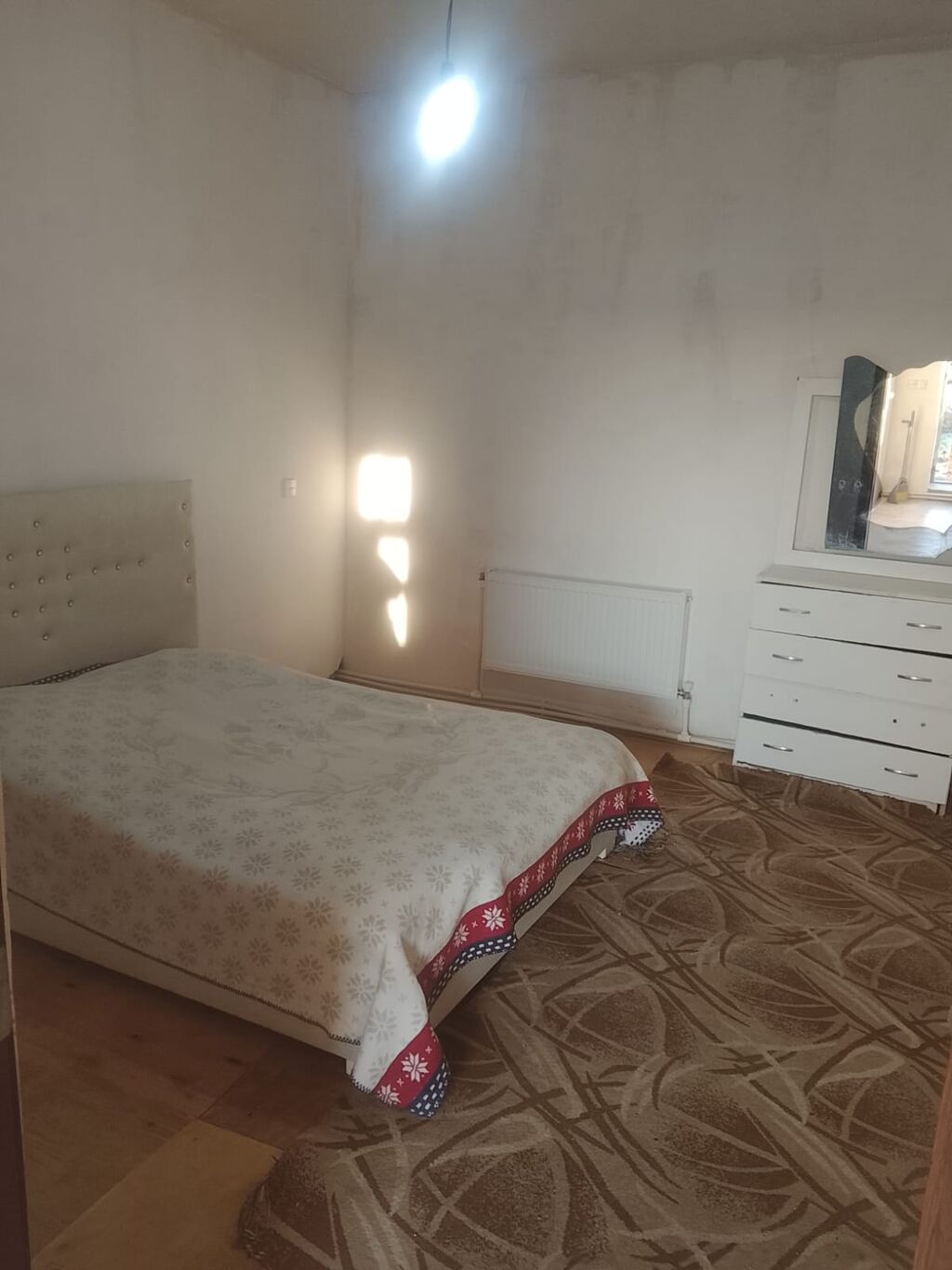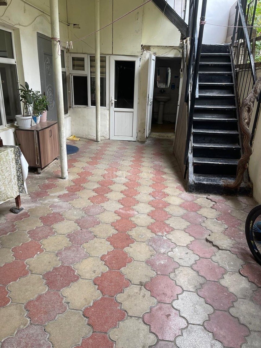 Yasamalda Günəş PETROL yaxınlığında 2 otaqlı həyət evi kirayə. - Plan: 1 mərtəbə, ayrıca həyətə çıxış. - Otaqlar: işıqlı zal və yataq otağı. - Mətbəx ayrıdır. - Hamam/tualet içəridə, kafel–metlax, güzgülü rəf, duş sistemi, döşəmədə trap. - Döşəmə mərmər naxışlı plitə. - İstilik sistemi: radiatorlar. - Pəncərələrdə krujevalı tül pərdələr. - Mebellər: zalda divan, kreslolar, komod. - Divar və tavanlar açıq rəng, səliqəli. Mətn şəklində göstərilən məlumat: “Yasamalda Günəş petrolun yanında iki otaqlı həyət evi kirayə verilir. Otaqlarda mətbəxdə, hamamd...”