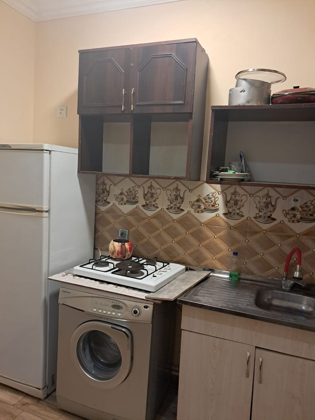 Metrolara yaxındır 1avtobusla 15dəqlik yoldur. 350 manat Tam mebellı və texnikalı kiçik mənzil: - Mətbəx: qazlı iki gözlü bişirmə paneli, soyuducu, paltaryuyan (Samsung), paslanmayan polad ləyənli mətbəx dolabı, üst və açıq rəf tipli asma şkaflar, qab-qacaq üçün yer. Divar paneli dekorativ kafel ilə. - Yemək zonası: 4 nəfərlik masa, taxta stullar. - Yataq otağı: 2 tək nəfərlik çarpayı, pərdə, şkaf, radiatorlu isitmə. - Döşəmə: laminat. - Pəncərə: plastik çərçivəli, açılan. - İşıqlandırma: tavan lustrası və otaqlarda ayrıca işıqlar. Sadə və praktik planlama: koridordan yataq otağına keçid, mətbəxdən eyvana/kiçik açıq sahəyə çıxış qapısı görünür. Gündəlik yaşayış üçün lazım olan əsas əşyala ...