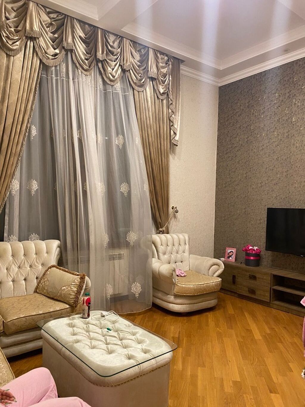 - Parlaq və hündür tavanlı qonaq otağı: iri pəncərə, dekorativ pərdələr, divar kağızı, TV üçün TV-stend, yumşaq mebel dəsti və şüşəli jurnal stolcuğu.