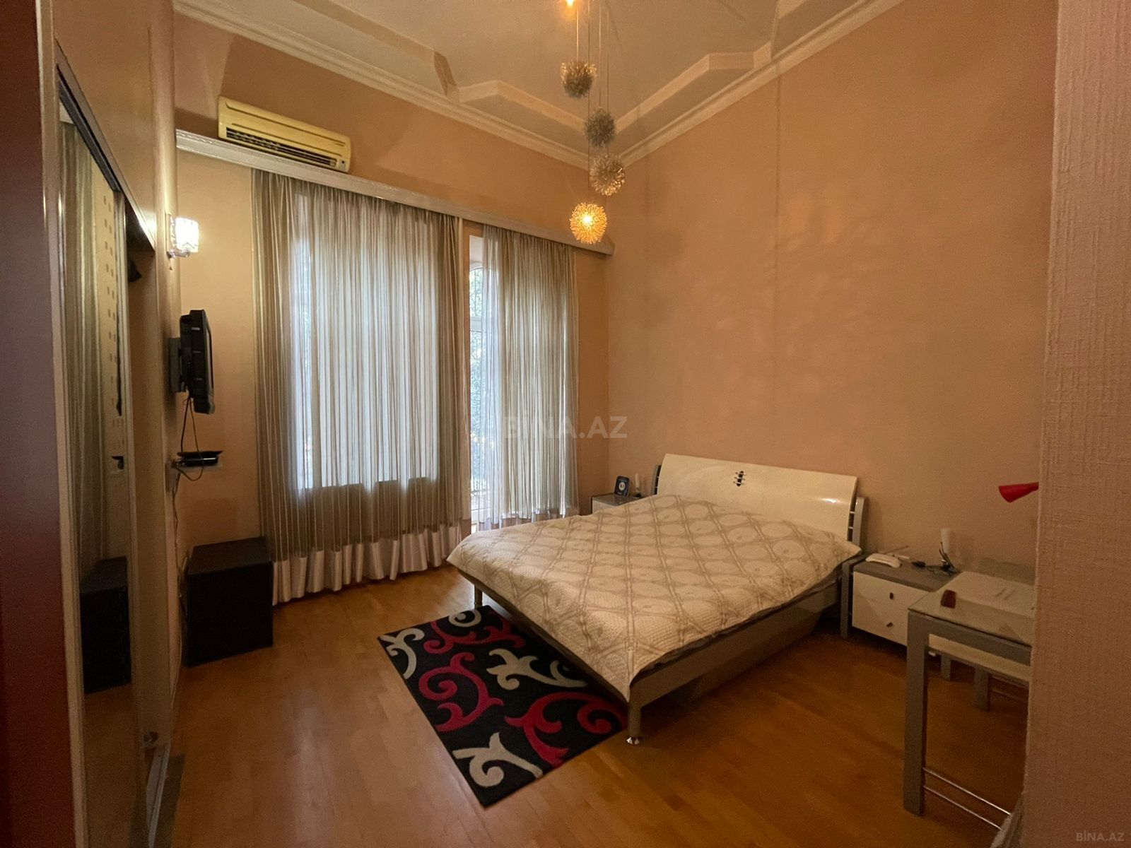Kirayə/icarə üçün geniş birotaqlı mənzil. - İşıqlı və səliqəli zal: pəncərələrə qədər uzanan açıq rəngli pərdələr, ağ tavan və punktual LED işıqlandırma. - Təbii ağac döşəmə: otağa isti və rahat ab-hava qatır, baxımı asandır. - Rahat yataq sahəsi: klassik başlıqlı çarpayı. - Yemək və iş üçün zona: divar boyunca iki masa və 4 taxta stul, gündəlik istifadə və qonaqlama üçün əlverişli. - Saxlama sistemi: divarboyu vitrin və şkaf modulları, açıq rəfli bölmələr. - Neytral tonlarda divar kağızı, ağ plintus və karnizlər. Yaşayış üçün əsas mebel və inventarla təmin olunub; həm istirahət, həm də iş/yemək üçün ayrılmış funksional zonalar mövcuddur. Təmiz və geniş planlama, praktik yerləşim və rahat ...
