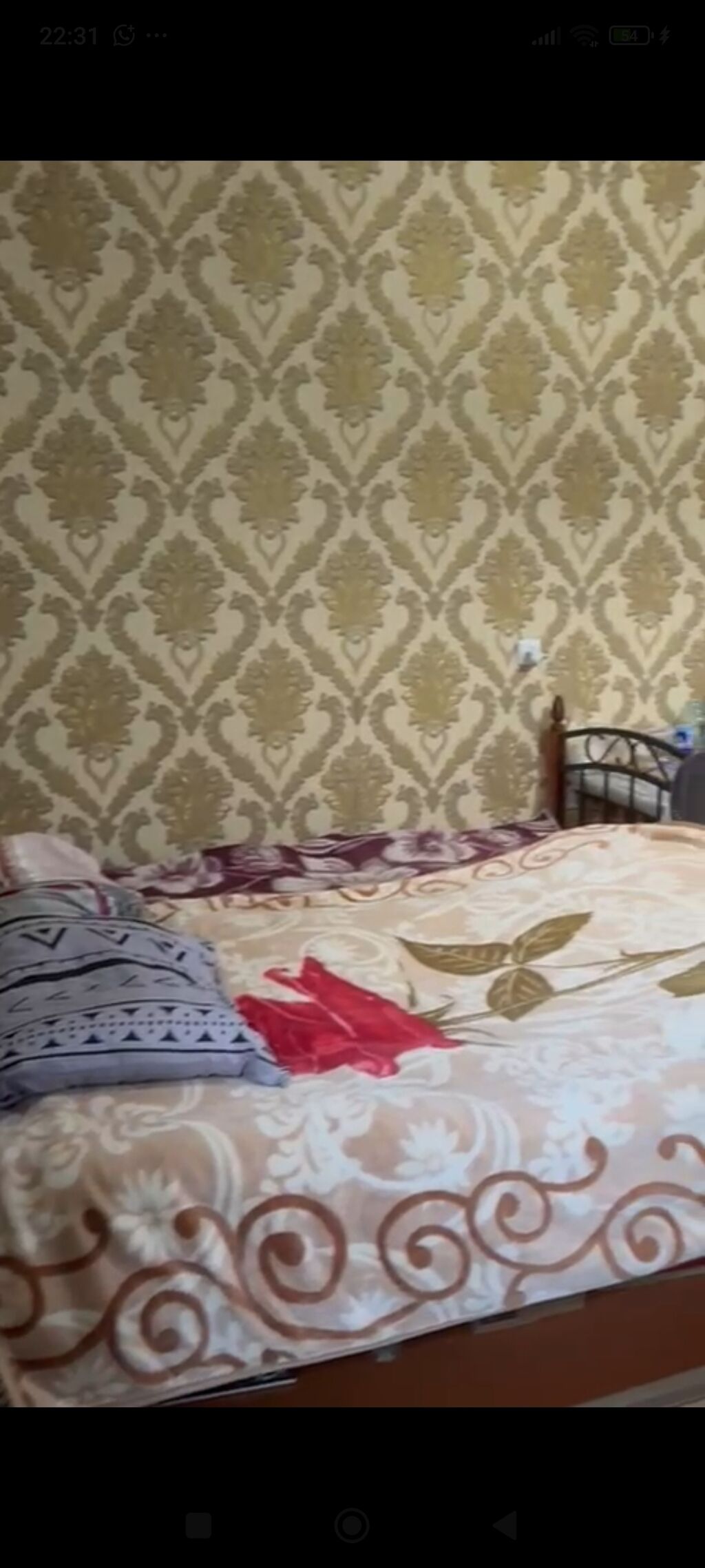 1 otaqlı kiçik mənzil – yataq otağı, mətbəx küncü və sanitar qovşaqla. - Yataq otağı: iki nəfərlik dəmir çərçivəli çarpayı, naxışlı divar kağızı, pəncərə ilə işıqlı məkan. Döşək, yorğan-örtük və yastıq görünür. - Mətbəx: qaz xətti çəkilmiş iki gözlü stolüstü plitə, elektrik çaydanı, süzgəcli kiçik lavabo, üst dolab və açıq rəflər, soyuducu. İş masası və masaüstü örtüklər, qab-qacaq üçün yer. - Döşəmə: kafel/parket görkəmli örtük. - İstilik: seksiyalı radiator. - Sanitar qovşaq: yarı kafelli hamam-tualet, pedastal lavabosu, əl duşu (duş sistemi), şlanqlı qarışdırıcı batareya, şərq tipli (hovuz) ayaqyolu, tualet fırçası və sabun üçün divar tutacağı. Kompakt planlaşdırma, gündəlik yaşayış üçün ...