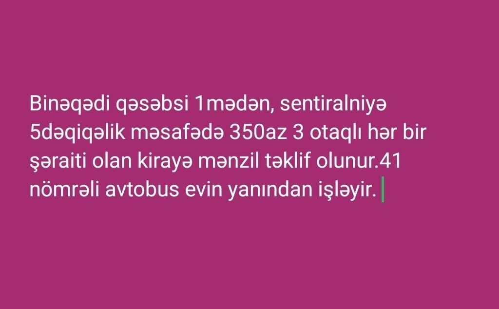 Binəqədi qəsəbəsi, 1 mədən. Sentrala 5 dəqiqəlik məsafədə yerləşən, 3 otaqlı, hər bir şəraiti olan kirayə mənzil təklif olunur. 41 nömrəli avtobus evin yanından keçir. Qiymət: 350 AZN.