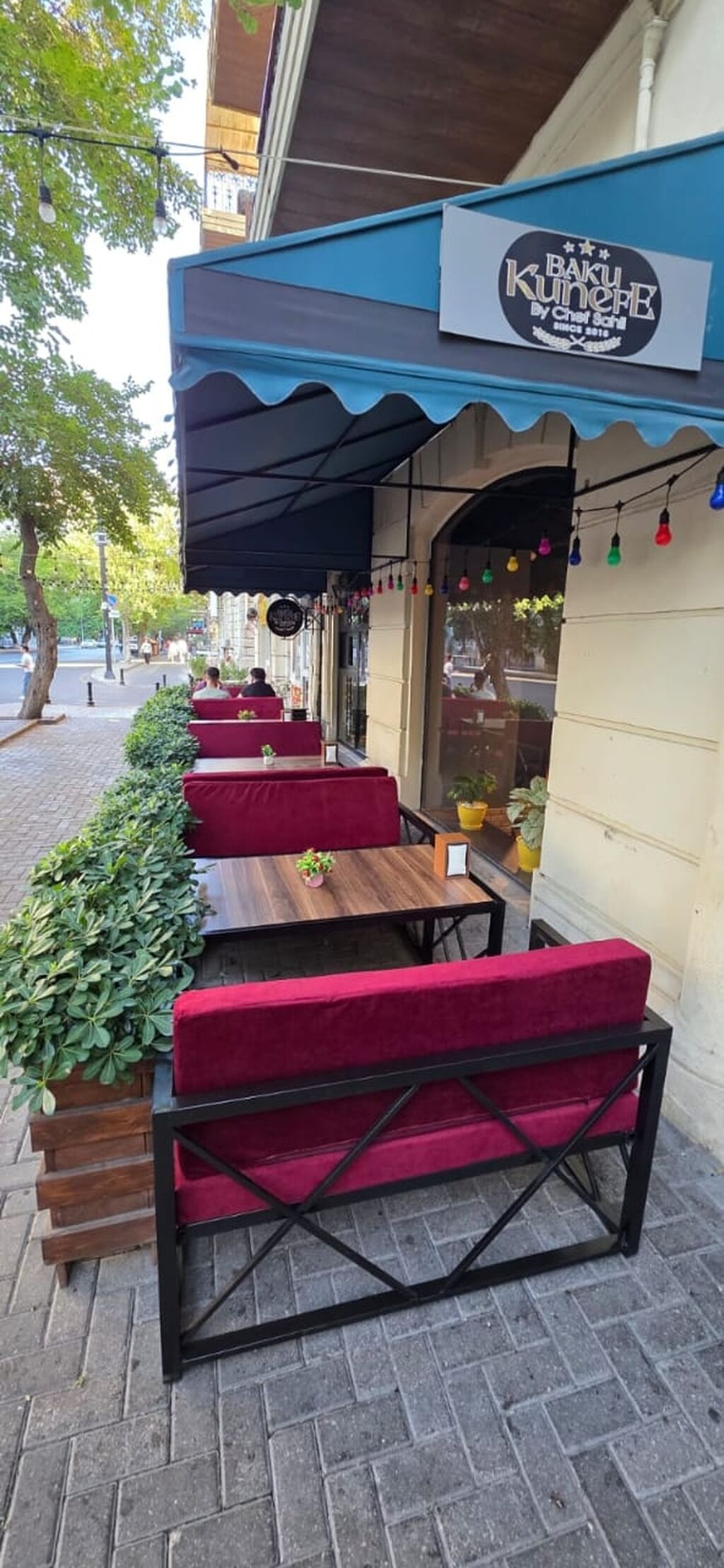 Açıq hava kafe/şirniyyat konsepti – “Baku Kunefe by Chef Sali” - Məkan tipi: küçə boyu terraslı kafe/şirniyyat evi - Yerləşim: səkidə ardıcıl yerləşdirilmiş masa‑skamyalar, dekorativ yaşıllıq divarları və rəngli işıq qirlandları - Oturma: metal karkaslı, bordo rəngli yumşaq skamyalar; hər masada 4–6 nəfər üçün rahat yerləşim - Masalar: taxta üstlü, kvadrat/dikdörtgə formalar; hər masada dekorativ kiçik bitkilər və salfetlik - Günəşlik: dalğalı kənarlı mavi tent, yağış və günəşdən qorunma - Vitrin və interyer: geniş şüşə önlük, içəridə dekorativ bitkilər, desert vitrininə uyğun görünüş - Konsept: türk şirniyyatı kunəfə tematikası (fasadda “Baku Kunefe by Chef Sali” loqosu) - Atmosfer: sakit ...