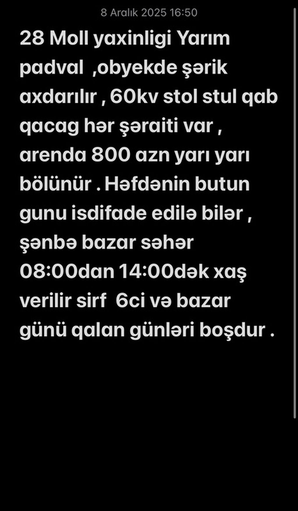28 Mall yaxınlığında yarımpadval obyektə şərik axtarılır. - Sahə: 60 kv.m - Komplekt: stol, stul, qab-qacaq mövcuddur, hər şərait var - Arenda: 800 AZN – xərclər yarı-yarı bölünür - İstifadə: həftənin bütün günləri istifadə oluna bilər - Xüsusi rejim: şənbə və bazar günləri saat 08:00–14:00-da xaş verilir; sırf 6-cı gün və bazar günü bu rejimdədir, qalan günlər boşdur