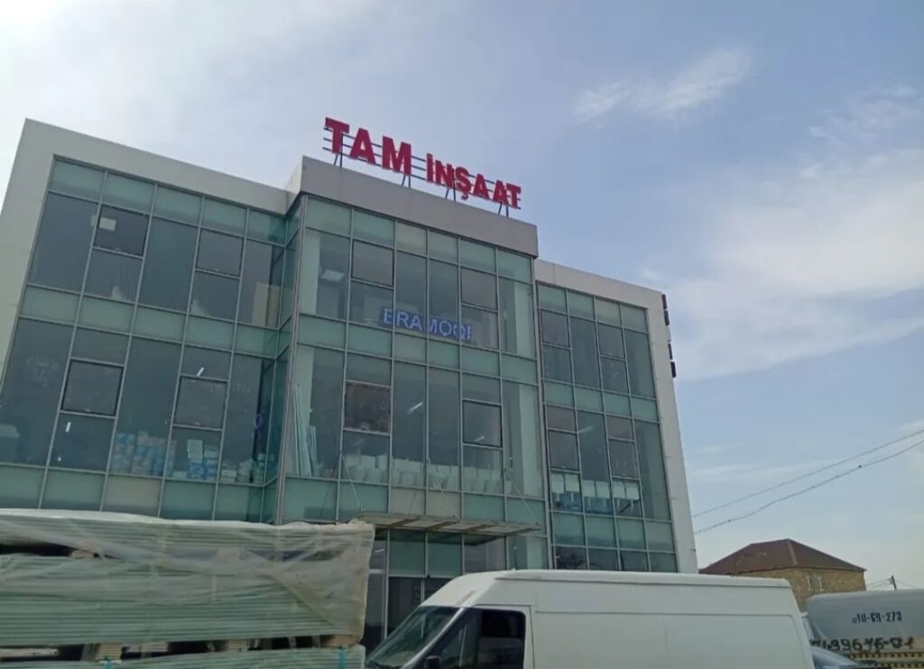 TAM İNŞAAT – tikinti və təmir üçün materiallar mağazası - Şüşə vitrinli çoxmərtəbəli anbar-mağaza - İnşaat və təmir üçün müxtəlif məhsullar: gips‑karton vərəqləri (paletlərlə), boya və kimyəvi materiallar, alçı və quru qarışıqlar, izolyasiya və üzlük materialları, şüşə və profillər, aksesuar və alətlər - Böyük həcmdə stok, layihələr üçün toplu yükləmə imkanı - Yük maşınları və furqonlarla daşımaya uyğun qablaşdırma Eyni binada “ERA MODE” yazılı bölmə görünür. Mağaza fasadında “TAM İNŞAAT” adı yerləşir.