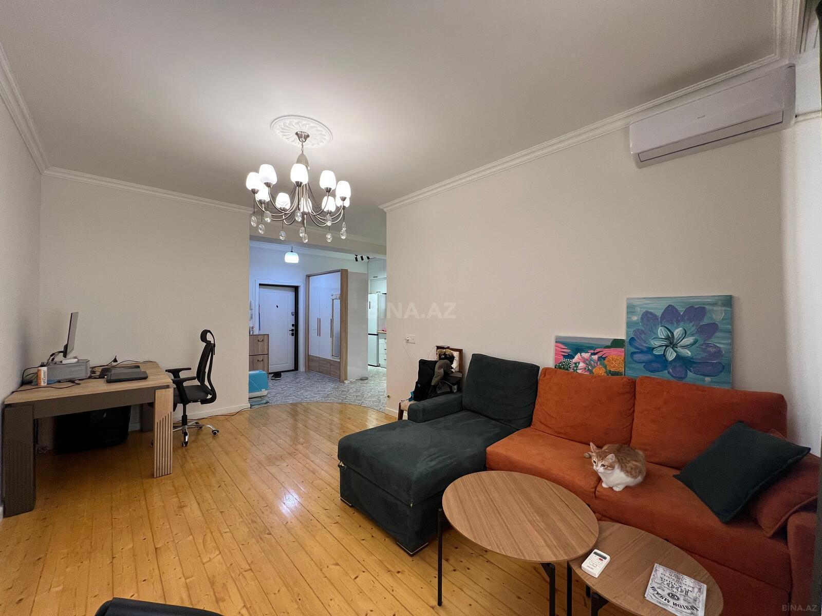 -=Mənzilin 49 kvm-lik zalı, iki sanitar qovşağı ( biri yataqda), üç balkonu var