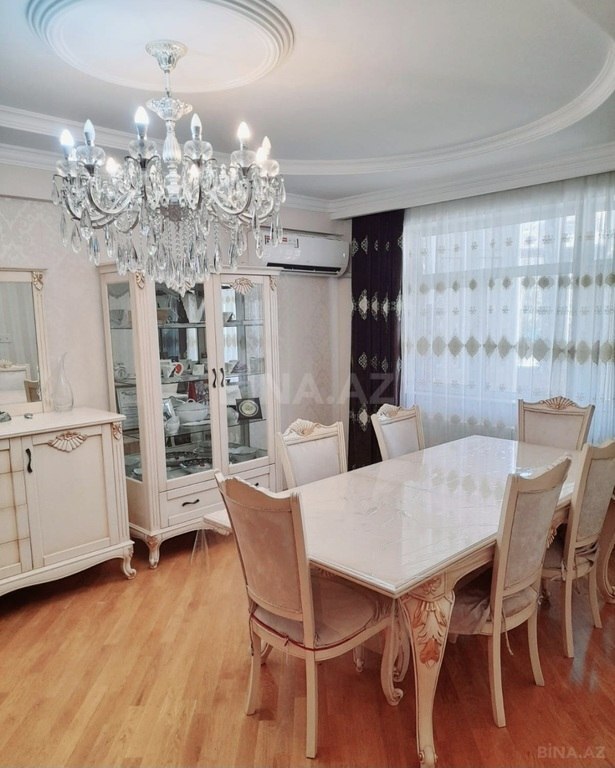 - Geniş, işıqlı zal: klassik üslubda divan‑kreslo dəsti, taxta vitrİN və komod, kristal çilçıraq, kondisioner, pərdələr, laminat döşəmə.