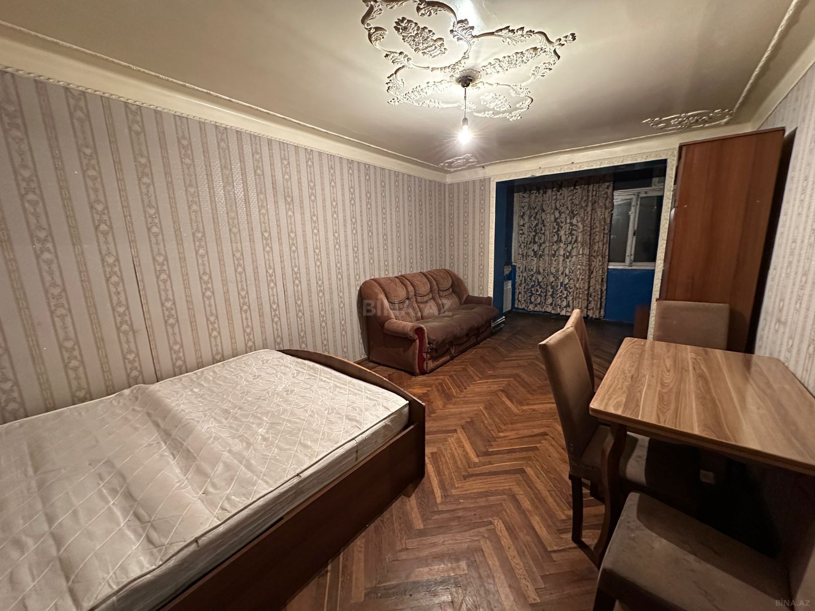 - Parket döşəmə, tavan rozetkası və pərdə karnizi ilə tamamlanan interyer.