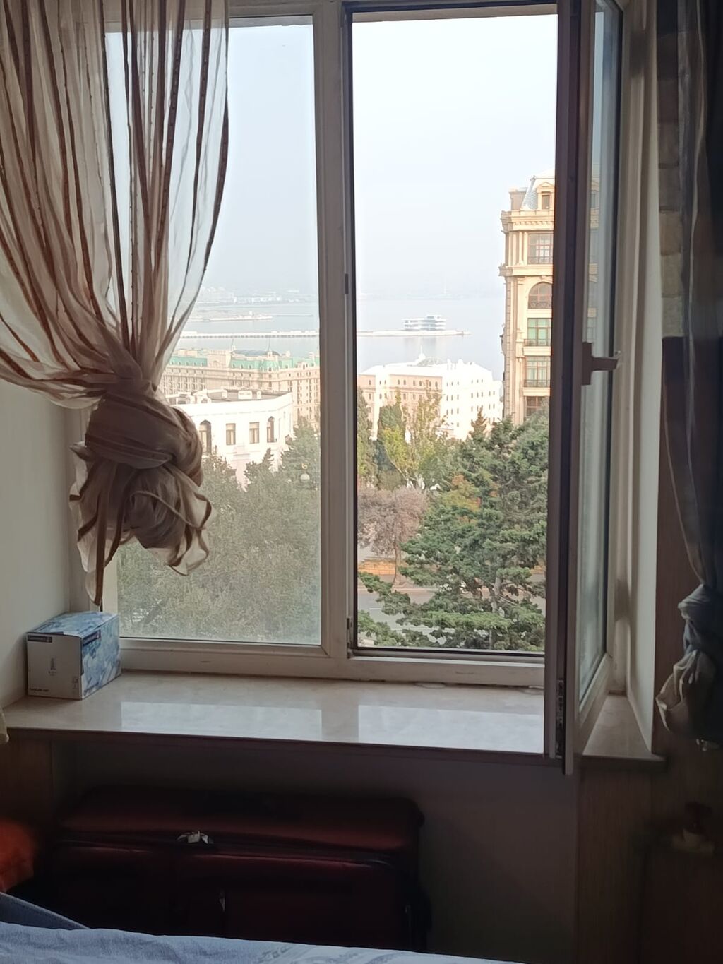 - Şəhər və dəniz panoramalı geniş pəncərə. Pəncərədən yaşıllıq, tarixi binalar və dənizkənarı sahə görünür.