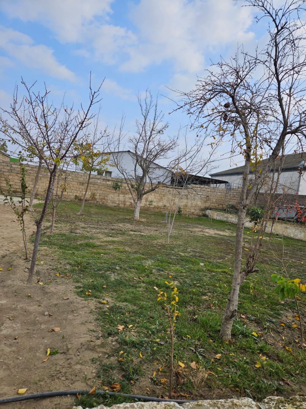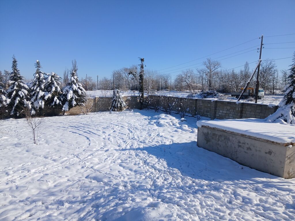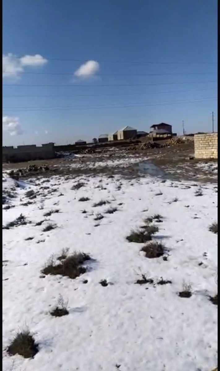 Torpaq sahəsi – hasarlı, kommunikasiya xətləri yaxınlıqda - Geniş həyət sahəsi, düz relyef - Beton-la örtülü su anbarı/qapalı quyu (şəkildə) - Küncləri iynəyarpaqlı ağaclarla əkilmiş, perimetri daş hasarla çevrələnmiş - Həyətdə yeni əkilmiş meyvə ağacları - Elektrik xətti küçənin kənarından keçir, dirəklər çəkilib - Geniş açıq məkan, istirahət guşəsi yaratmaq üçün əlverişli - Kənd təsərrüfatı və bağçılıq üçün uyğun - Sakit ərazi, açıq mənzərə, qonşuluqda bağ sahələri Qeyd: Şəkillər qarlı mövsümdə çəkilib; sahənin planlaşdırılması və ya əlavə abadlıq işləri üçün çoxlu boş yer mövcuddur.