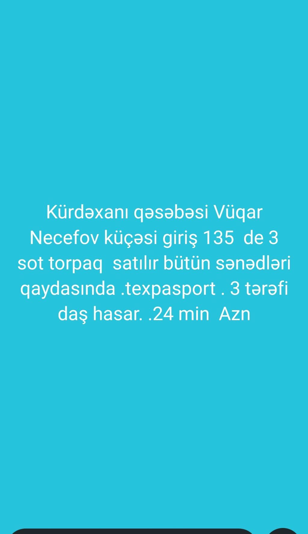 ABSERON MASAZIR QESEBESINDE YENI 15 SOT TORPAQ SATIṢA CIXDI. Teeecilii Biznes qurmaq isteyen Obyekt tikmey isteyen Ev tikmey isteyen Apartman tikmey isteyen Bina tikmey isteyen buyursun INSALLAH KUBÇLIDI TEYINAT XUSUSI MULKIYYET TIKINTI TƏYINATLI YASAYIS MENTEQELERI YAZILIB KUBÇADA ev tik evə kubça al 2 terefi yoldur HER IKI TEREFE TIKINTI EDE BILERSIZ QANUNI SENED QANUNI KUBÇA ALQI SATQI NATARUSDA OLACAQ 2 terefi. Zabordu Qaz su isiq var merkezi kanalzasiya qarsisinda Internet yaninda Etraf yasayiS EVLER OBYEKTLER CANTEPEDE DEYIRLER TAM MERKEZDE YOLU ASVALTDIR MASAZIRIN GIRISIDI Kubcasi texpasportu alqisatqi muqavilesi var Hundur massivde yerlesir Masazirin bineqedi terefden girisi 142 ...
