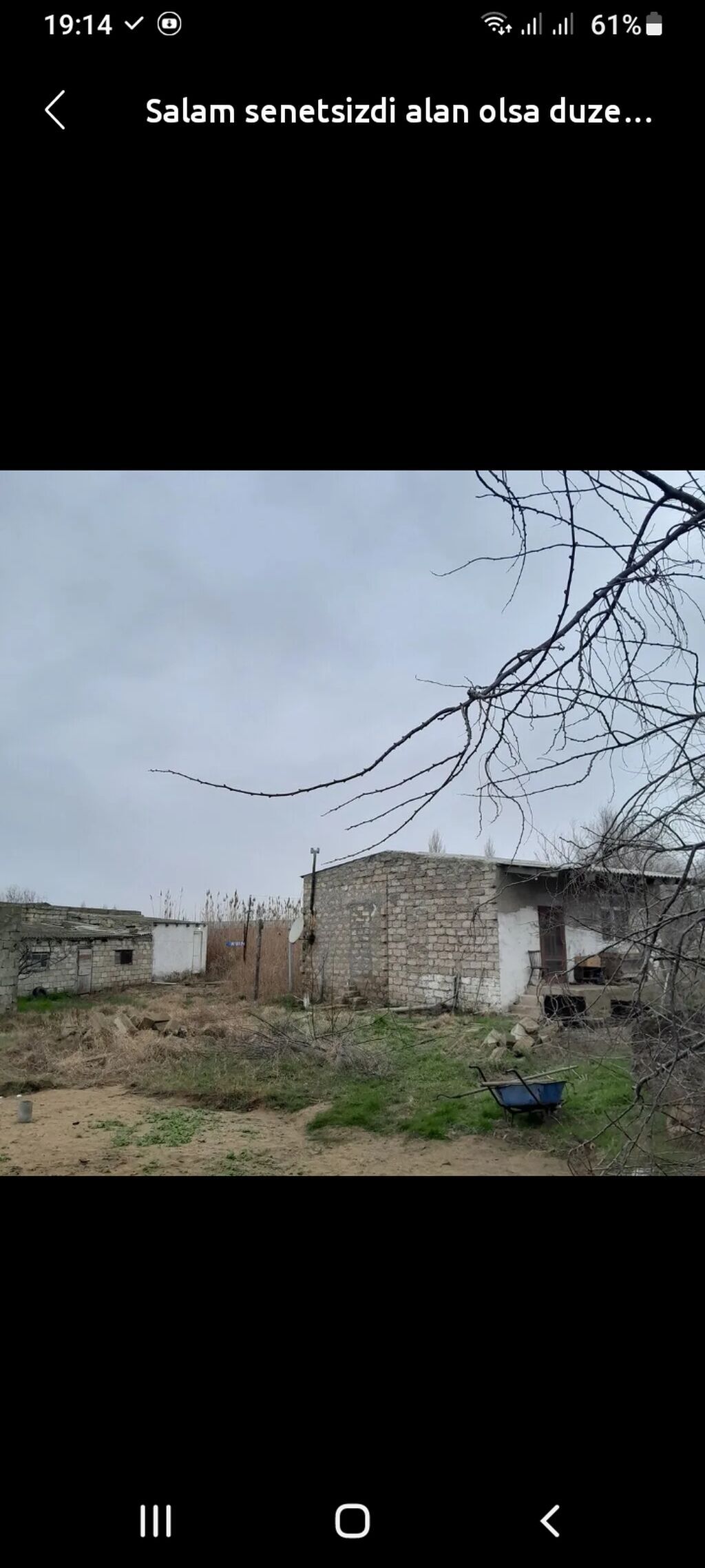 Torpaq sahəsi və köhnə tikili - Kənd təsərrüfatı və ya fərdi yaşayış üçün yararlı torpaq sahəsi - Həyətdə daş divarlı, bir mərtəbəli köhnə tikili və əlavə yardımçı tikililər - Geniş həyət: ağac əkini, tərəvəzçilik, heyvandarlıq və anbarlama üçün əlverişli - Giriş pilləkəni olan eyvan, pəncərə və qapılar mövcuddur - Həyətdə suvaq tələb edən divarlar, yarımçıq sahələr və təmir-bərpa üçün imkanlar - Təbii qaz, su və elektrik xəttlərinin qoşulması üçün yaxınlıqda infrastruktur - Həyətdə iş arabası (taxta-araba) və təsərrüfat işləri üçün uyğun boş sahə Qeyd: Şəkildə “senətsizdir” məlumatı qeyd olunub.