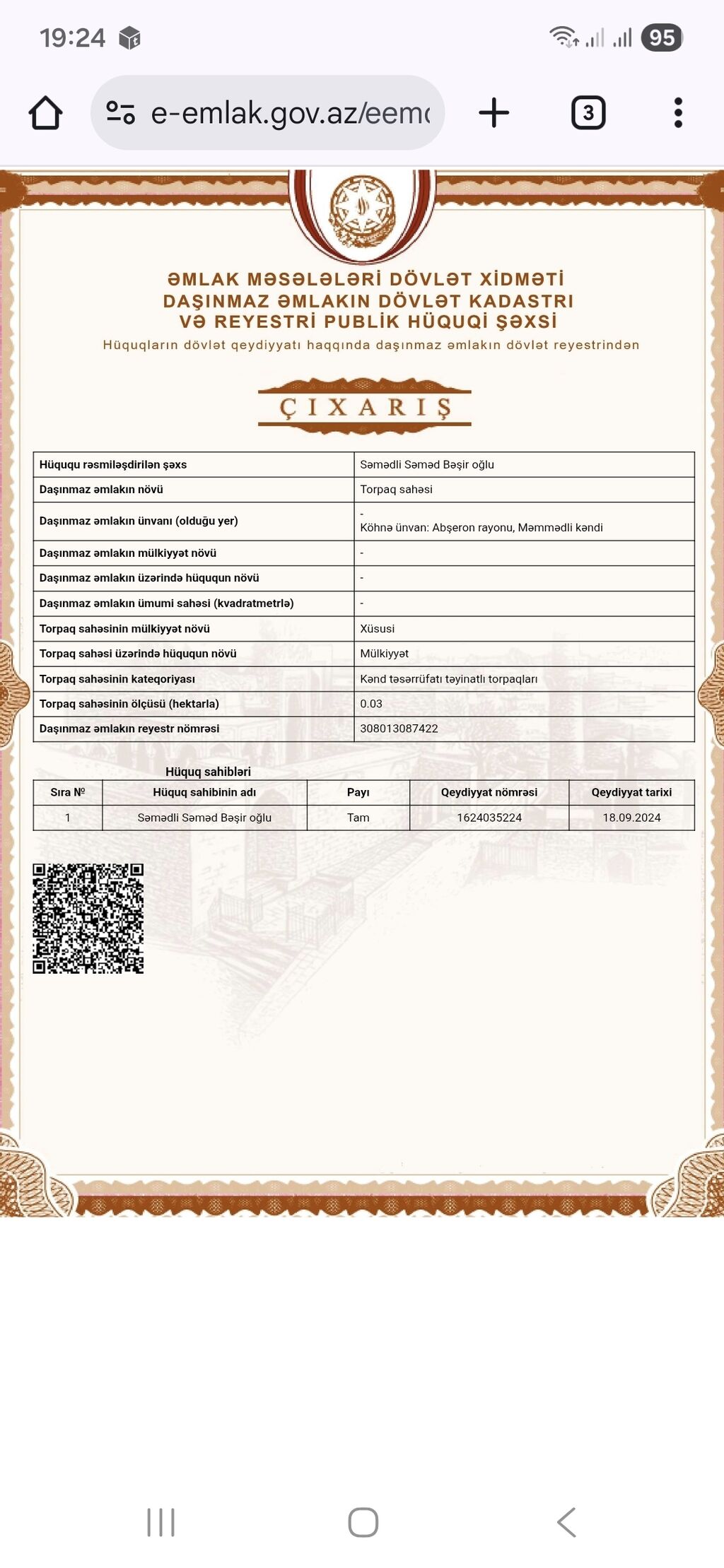 TƏCİLİ SATILIR – Abşeron rayonu, Saray qəsəbəsində 6 sot torpaq sahəsi! Yer: Abşeron rayonu, Saray qəsəbəsi Sahə: 6 sot Sənədlər: Çıxarış (Kupça) və texniki pasport Təyinat: Həyətyanı sahə ✨ Üstünlüklər: Yeni əsas yoldan cəmi 100–150 metr məsafədə Rahat çıxışı və düz relyefi var Yaşayış və ya tikinti üçün tam əlverişli ərazi Ətrafda aktiv yaşayış mövcuddur Sotu: 8.000 AZN Ümumi qiymət: 48.000 AZN (real alıcıya cüzi endirim mümkündür) Əlaqə: Ətraflı məlumat və baxış üçün dərhal zəng edin! Ofis haqqı: 1%