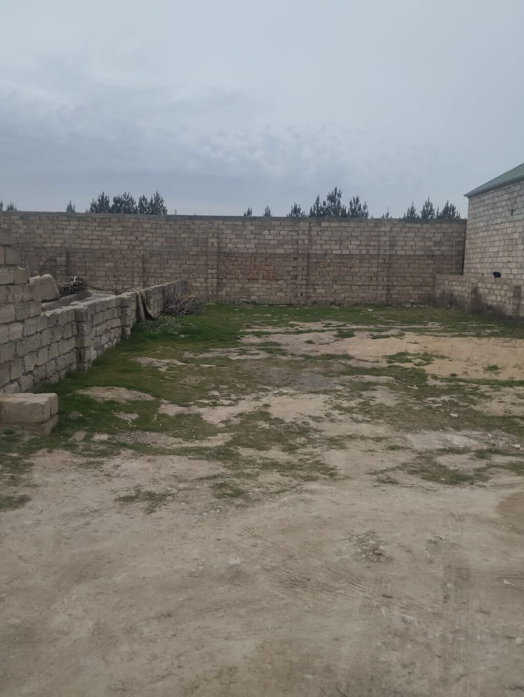 Torpaq sahəsi və yardımçı tikililər ünvan Binə qəsəbəsi savxozda - Hündür daş hasarla əhatələnmiş həyət. - Düz relyefli, geniş boş sahə – bağ salmaq, fərdi ev və ya təsərrüfat məqsədləri üçün uyğun. - Həyətin daxilində su çəni (IBC konteyner) mövcuddur. - Köməkçi tikililər: daşdan inşa olunmuş tövlə/ommbar tipli otaqlar, üzəri şiferlə örtülü dam. - Həyət daxilində nərdivan, iş üçün masa və anbar kimi istifadə oluna biləcək sahələr. - Qonşuluqda yaşayış evləri yerləşir, məhəllə infrastrukturu formalaşıb. - Divarlar möhkəm bərk daşdan hörülüb, giriş hissəsi genişdir. Təsərrüfat qurmaq, emalatxana/anbar yaratmaq və ya fərdi yaşayış evi tikmək istəyənlər üçün əlverişli sahə.