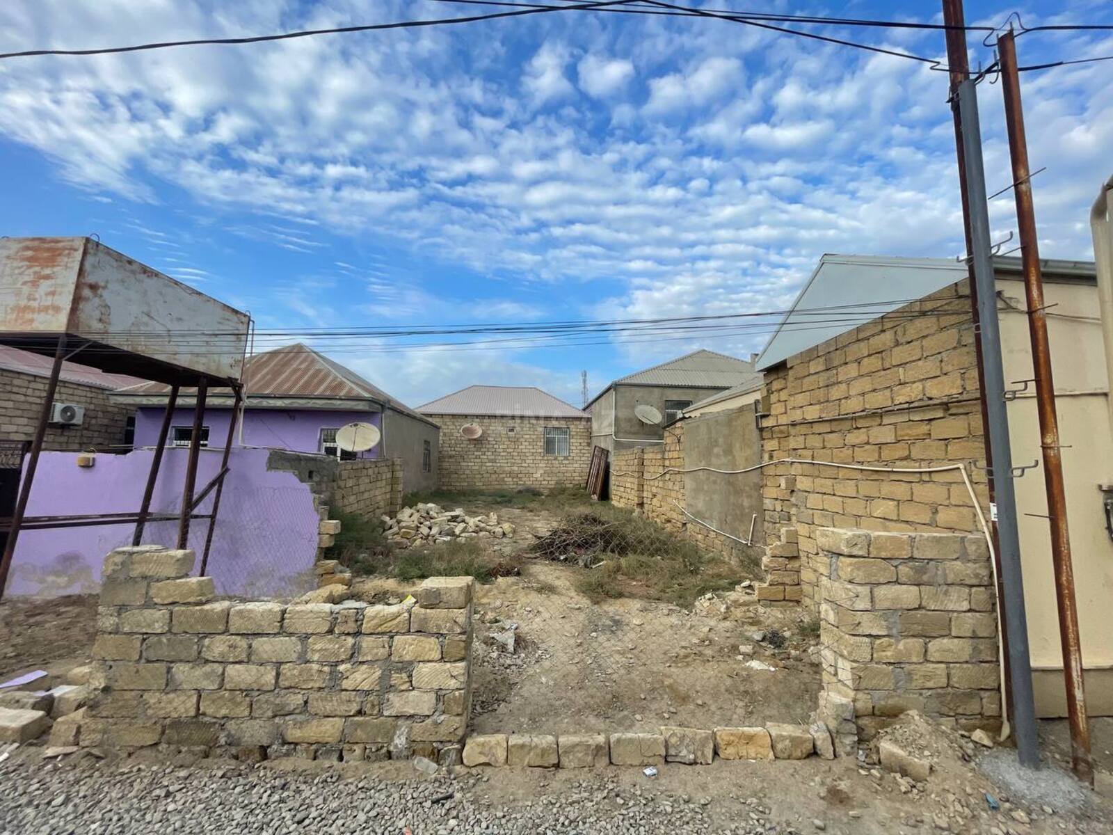 Torpaq sahəsi – daş hasarla əhatələnmiş, metal darvazalı. - Məkan: yaşayış məhəlləsi, ətrafda fərdi evlər mövcuddur. - Sahə: şəkillərdə görüldüyü kimi düzbucaqlı planlı, həyət daxili boşdur, tikinti üçün yararlı relyef. - İnfrastruktur: küçəyə çıxışı olan darvaza, hazır hasar (qalaq daşdan). Yaxınlıqda elektrik xətləri görünür. - İstifadə imkanları: fərdi yaşayış evi, bağ evi və ya təsərrüfat tikintisi üçün əlverişli. - Təhlükəsizlik və məxfilik: sahə tam hasarlanıb, qonşu evlərə yaxın yerləşmə. Əlavə qeydlər: sahənin daxilində alaq örtüyü var, təmizlənmədən sonra planlama və tikintiyə hazır vəziyyətə gətirilə bilər.