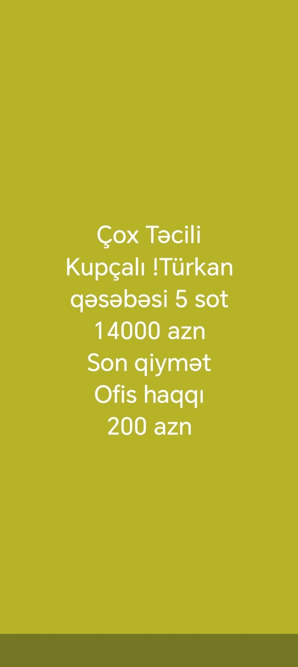 KUPÇALI !!Türkan qəsəbəsi Sərhəd qoşunları binalarina 1 km məsafədə 5 sot, hasarın içərisində torpaq sahəsi satılır. Torpaqın ətrafı tam yaşayışlı ərazidir.Ofis haqqı 200 azn Qiymət sondur endirim olmayacaq, Xəritədə konum dəqiq deyil.Dəqiq konumu bizdədir.