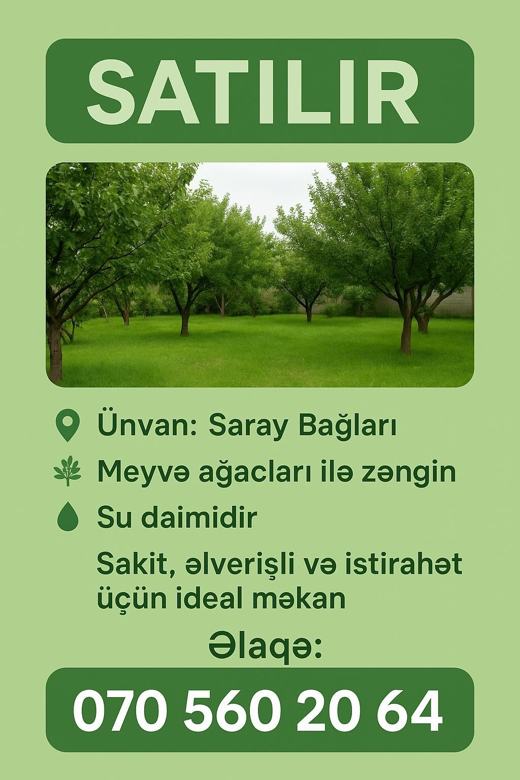 Xəzər rayonu Şüvəlan qəsəbəsi Hacı Mövlan bağları adlanan ərazidə, ana yoldan 700-800 metr məsafədə, yolu tam asfalt olan 8 sot torpaq satışa çıxarılıb. Topraq sahəsində bütün kammunal xətləri mövcuddur. Sənədləri tam qaydasındadır çıxarış (kupça var) Qeyd: 1ci şəkildə görüldüyü kimi torpaq sahəsi bir neçə sota bölünüb. Ətrafda artıq tikiliş gedir.